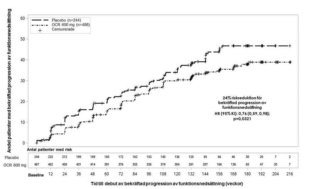 Resultaten från denna studie visar att ocrelizumab signifikant försenar sjukdomsprogression och reducerar försämringen av gånghastigheten jämfört med placebo.