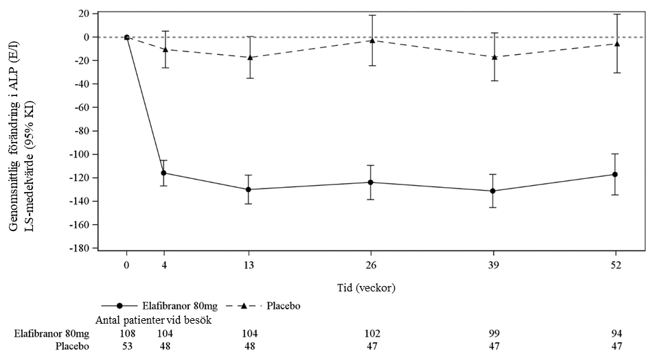 En signifikant minskning av ALP från utgångsvärdet sågs så tidigt som i vecka 4 och var ihållande under 52 veckors behandling i elafibranorgruppen jämfört med placebo (Figur 1).