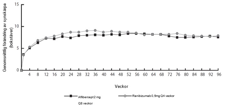 I båda studierna var det primära effektmåttet den genomsnittliga förändringen av BCVA från studiestart till vecka 52 och både aflibercept 2Q8- och aflibercept 2Q4‑grupperna visade på statistisk signifikans och var överlägsna kontrollgruppen. Denna nytta kvarstod till vecka 100.