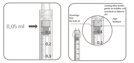 9.Ta bort alla luftbubblor och allt överskott av läkemedel genom att långsamt trycka ned kolven så att den platta kolvkanten ligger i linje med markeringen 0,05 ml på sprutan.
