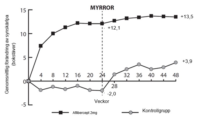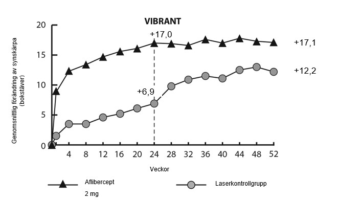 Skillnaden mellan behandlingsgrupperna var statistiskt signifikant till fördel för aflibercept såväl för det primära effektmåttet (förändring av BCVA) som för det bekräftande sekundära effektmåttet (andel patienter som ökade 15 bokstäver på BCVA) vecka 24 jämfört med studiestart. Skillnaderna för båda effektmåtten bibehölls till och med vecka 48.