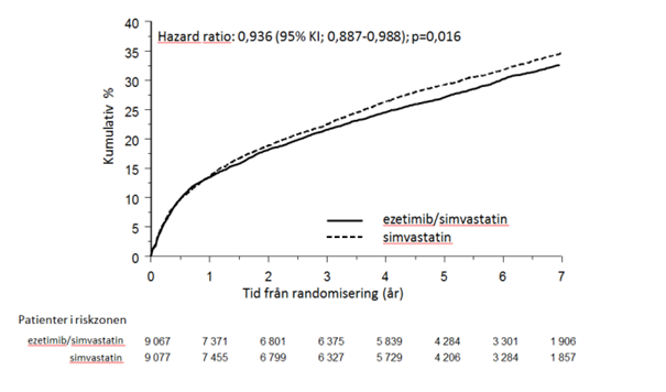 Det primära effektmåttet var sammansatt och bestod av kardiovaskulär död, allvarliga kardiovaskulära händelser (definierade som icke-fatal hjärtinfarkt, dokumenterad instabil angina som krävde sjukhusinläggning eller koronar revaskularisering minst 30 dagar efter randomisering) och icke-fatal stroke. Studien visade positiv effekt av kombinationsbehandling med ezetimib/simvastatin på det primära effektmåttet sammansatt av kardiovaskulär död, allvarliga kardiovaskulära händelser och ickefatal stroke jämfört med enbart simvastatin (relativ riskreduktion 6,4 %, p = 0,016). Det primära effektmåttet inträffade hos 2 572 av 9 067 patienter (7 års Kaplan-Meier [KM]-värde 32,72 %) i ezetimib/simvastatingruppen och 2 742 av 9 077 patienter (7 års KM-värde 34,6 7 %) i gruppen med enbart simvastatin. (se bild 1 och tabell 6.) Denna positiva effekt gentemot behandling med enbart statiner, förväntas vara likvärdig vid kombinationsbehandling med ezetimib och atorvastatin. Total mortalitet var oförändrad i denna högriskgrupp.