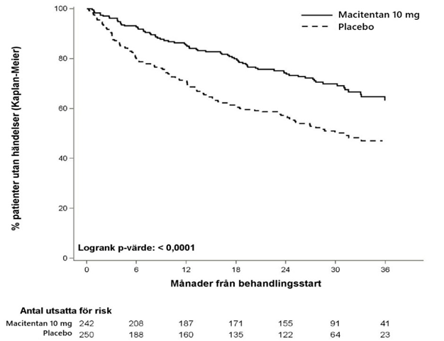 Risken för PAH-relaterad död eller sjukhusinläggning på grund av PAH fram till EOT minskade med 50 % hos patienterna (HR 0,50; 97,5% CI: 0,34 till 0,75; logrank p < 0,0001) som fick macitentan 10 mg (50 händelser) jämfört med placebo (84 händelser). Vid 36 månader hade 44,6 % av patienterna som fått placebo och 29,4 % av patienterna som fått macitentan 10 mg (Absolut Riskreduktion = 15,2 %) varit inlagda på sjukhus till följd av PAH eller avlidit till följd av PAH-relaterade orsaker.