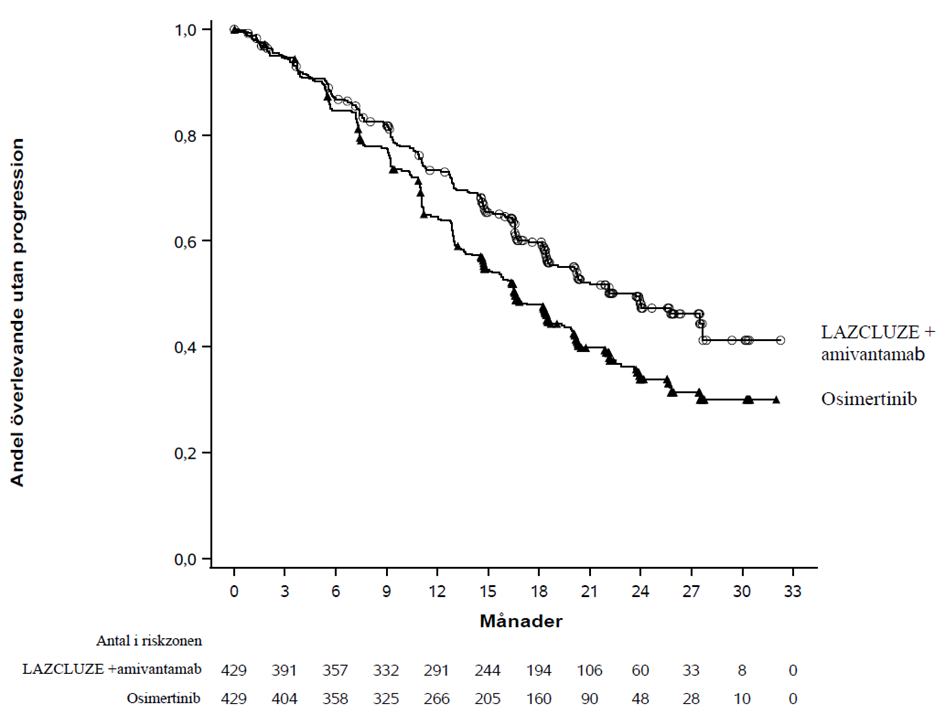 Totalt 1 074 patienter randomiserades (2:2:1) till att få Lazcluze i kombination med amivantamab, osimertinib som monoterapi eller Lazcluze som monoterapi fram till sjukdomsprogression eller oacceptabel toxicitet. Lazcluze administrerades oralt i dosen 240 mg en gång dagligen. Amivantamab administrerades intravenöst i dosen 1 050 mg (hos patienter < 80 kg) eller 1 400 mg (hos patienter ≥ 80 kg) en gång i veckan i 4 veckor och därefter varannan vecka från vecka 5. Osimertinib administrerades oralt i en dos på 80 mg en gång dagligen. Randomiseringen stratifierades efter EGFR-mutationstyp (exon 19-deletion eller substitutionsmutation L858R i exon 21), etnicitet (asiatisk eller icke-asiatisk) och tidigare hjärnmetastaser (ja eller nej).