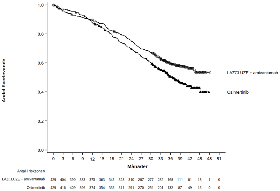 Den slutliga analysen av OS visade en statistiskt signifikant förbättring i OS för Lazcluze i kombination med amivantamab jämfört med osimertinib (se tabell 4 och figur 2).