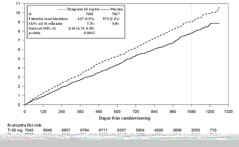 Både regimerna 60 mg två gånger dagligen och 90 mg två gånger dagligen av tikagrelor i kombination med ASA var överlägsna enbart ASA vid preventionen av aterotrombotiska händelser (sammansatt effektmått: kardiovaskulär död, hjärtinfarkt och stroke), med en enhetlig behandlingseffekt över hela studieperioden, vilket gav en RRR på 16 % och en ARR på 1,27 % för tikagrelor 60 mg och en RRR på 15 % och en ARR på 1,19 % för tikagrelor 90 mg.