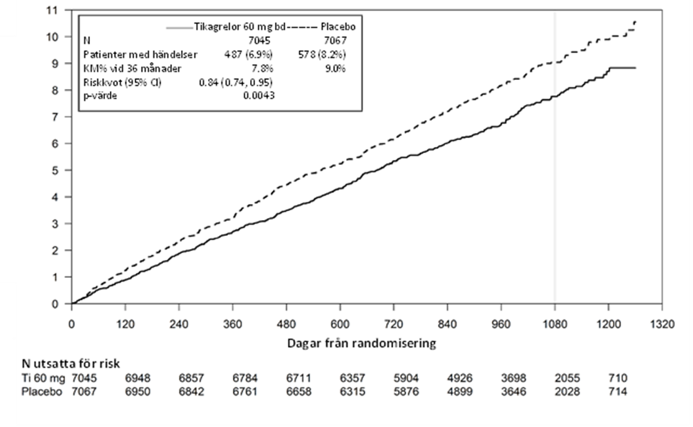 I relation till enbart ASA, reducerade tikagrelor 60 mg två gånger dagligen signifikant det primära sammansatta effektmåttet för kardiovaskulär död, hjärtinfarkt och stroke. Var och en av komponenterna bidrog till reduktionen av det primära sammansatta effektmåttet (kardiovaskulär död 17 % RRR, hjärtinfarkt 16 % RRR och stroke 25 % RRR).