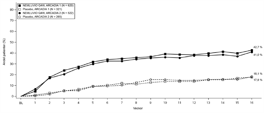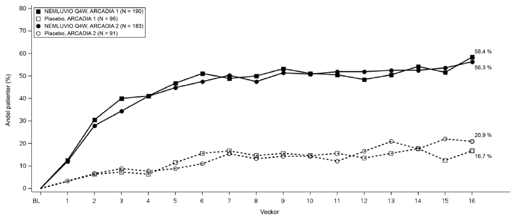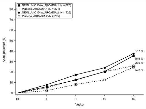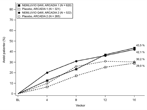 Signifikant förbättring av pruritus hos patienter som behandlades med nemolizumab i ARCADIA 1 och ARCADIA 2 jämfört med placebo baserat på PP NRS-förbättringar ≥ 4 poäng och PP NRS procentuell förändring från baslinjen observerades från och med vecka 1 och bibehölls fram till vecka 16 (tabell 3 och figur 2). Resultaten var överensstämmande i populationen med svår klåda (baslinje-PP NRS ≥ 7 poäng).