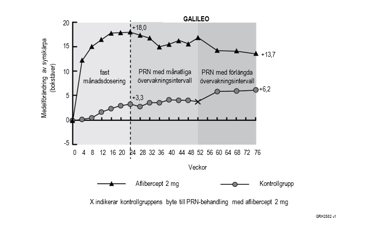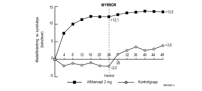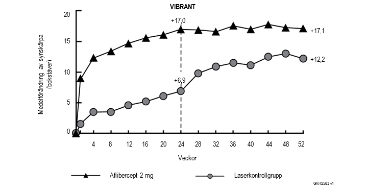 Skillnaden mellan behandlingsgrupperna var statistiskt signifikant till fördel för aflibercept såväl för det primära effektmåttet (förändring av BCVA) som för det bekräftande sekundära effektmåttet (andel patienter som ökade 15 bokstäver på BCVA) vecka 24 jämfört med studiestart. Skillnaderna för båda effektmåtten bibehölls till och med vecka 48.