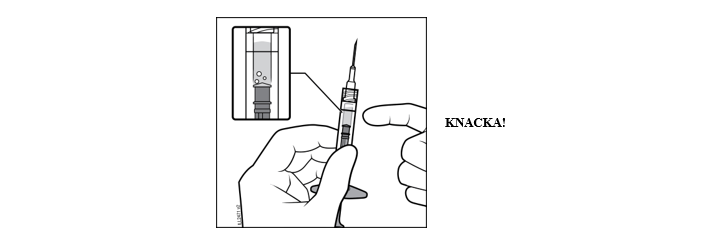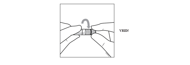 Ta bort sprutans lock genom att hålla sprutan i en hand samtidigt som du med den andra handen tar tag i sprutans lock med tummen och pekfingret. Observera! Du ska vrida av (inte bryta av) sprutans lock.