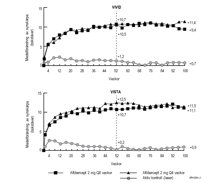 I båda studierna var det primära effektmåttet den genomsnittliga förändringen av BCVA från studiestart till vecka 52 och både aflibercept 2Q8- och aflibercept 2Q4-grupperna visade på statistisk signifikans och var överlägsna kontrollgruppen. Denna nytta kvarstod till vecka 100.