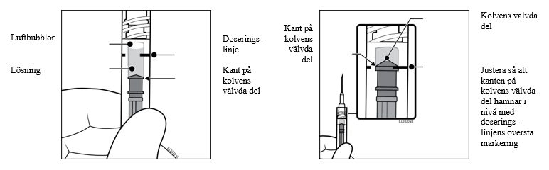 OBS: Korrekt placering av kolven är mycket viktigt eftersom felaktig placering av kolven kan leda till att för mycket eller för lite av den rekommenderade dosen administreras.