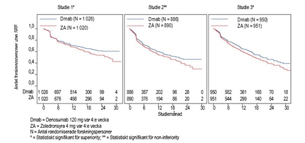I samtliga tre studier var sjukdomsprogressionen densamma för denosumab och zoledronsyra. Så var också fallet för den i förväg specificerade analysen av de tre studierna tillsammans.