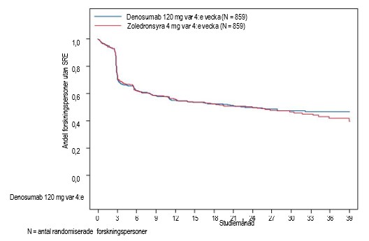 Effekt och säkerhet av 120 mg denosumab subkutant var 4:e vecka eller 4 mg zoledronsyra (dosjusterad vid nedsatt njurfunktion) intravenöst var 4:e vecka jämfördes i tre randomiserade, dubbelblindade, aktivt kontrollerade studier hos patienter med avancerad cancer med skelettmetastaser och som var behandlingsnaiva för intravenösa bisfosfonater: vuxna med bröstcancer (studie 1), andra solida tumörer eller multipelt myelom (studie 2) och kastratresistent prostatacancer (studie 3). I dessa kliniska prövningar med aktiv kontroll utvärderades säkerheten hos 5 931 patienter. Patienter med en anamnes av ONJ eller osteomyelit i käken, pågående tand- eller käkbesvär som krävde käkkirurgi, oläkta sår efter tand- eller käkkirurgi eller med ett inplanerat invasivt tandingrepp fick inte delta i dessa studier. De primära och sekundära effektmåtten utvärderade förekomst av en eller flera skelettrelaterade händelser (SRE). I studier där denosumab visade sig vara mer effektivt än zoledronsyra erbjöds patienterna deltagande i en på förhand specificerad fas med utökad denosumab-behandling på 2 år. En SRE definierades som något av följande: patologisk fraktur (kot- eller icke-kotfraktur), strålbehandling av skelettet (inklusive användning av radioisotoper), skelettkirurgi eller ryggmärgskompression.
