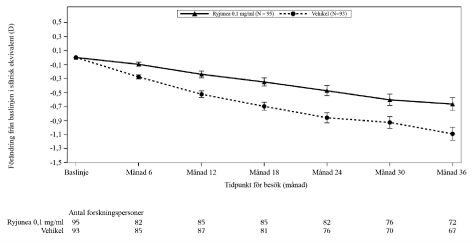 En högre behandlingseffekt observerades hos deltagare med en progressionshastighet på 0,5 D eller mer per år. I denna förspecificerade undergrupp observerades en skillnad i genomsnittlig APR på 0,207 D (95 % KI: 0,112; 0,302) för 0,1 mg/ml Ryjunea jämfört med vehikel vid 24 månader och en skillnad i genomsnittlig APR på 0,154 D (95 % KI: 0,073; 0,236) för 0,1 mg/ml Ryjunea jämfört med vehikel vid 36 månader. En skillnad i genomsnittlig förändring från baslinjen i sfärisk ekvivalent (SE) på 0,388 D (95 % KI: 0,190; 0,585) observerades för Ryjunea 0,1 mg/ml jämfört med vehikel vid 24 månader, och en genomsnittlig förändring från baslinjen i sfärisk ekvivalent på 0,425 D (95 % KI 0,170; 0,681) observerades för Ryjunea 0,1 mg/ml jämfört med vehikel vid 36 månader (tabell 2). Figur 1 visar den genomsnittliga förändringen från baslinjen i SE till och med 36 månader och skillnaden mellan behandlings- och vehikelgrupper hos patienter med en progressionshastighet på 0,5 D eller mer per år.