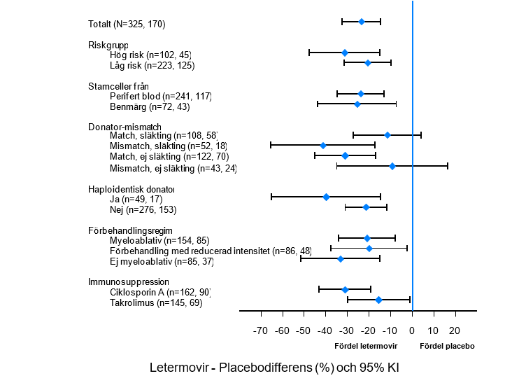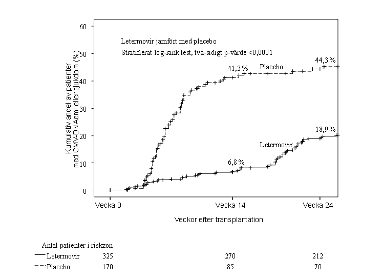 I en fas 3‑studie (P001) har säkerheten och effekten av letermovir fastställts hos HSCT‑patienter med negativt testresultat för CMV‑DNA före initiering av profylaktisk behandling. CMV‑DNA monitorerades veckovis till vecka 14 efter transplantation och därefter varannan vecka till vecka 24. Profylax med letermovir avbröts och preemptiv standardbehandling (PET) påbörjades vid kliniskt signifikant CMV‑DNAemi eller sjukdom. För patienter där profylax med letermovir påbörjades och för vilka test av CMV‑DNA vid baseline senare visade sig vara positivt, kunde profylaktisk behandling fortsätta om kriterierna för PET inte hade uppfyllts (se avsnitt 5.1).