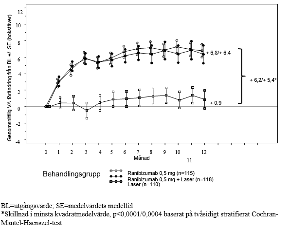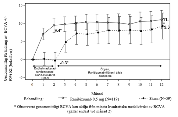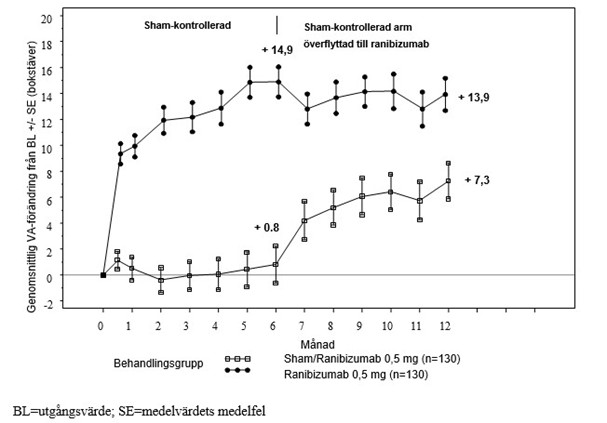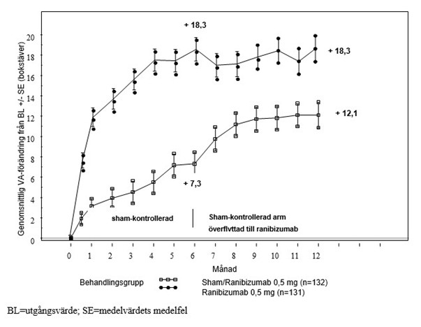 10 mg/ml, n=51) eller sham (n=49) med månatliga intravitreala injektioner. Genomsnittlig förändring i BCVA från månad 1 till 12 jämfört med utgångsvärdet var +7,8 (±7,72) bokstäver för den sammanslagna gruppen ranibizumabbehandlade patienter (n=102), jämfört med –0,1 (±9,77) bokstäver för sham-behandlade patienter, och den genomsnittliga förändringen i BCVA vid månad 12 från utgångsvärdet var 10,3 (±9,1) bokstäver jämfört med -1,4 (±14,2) bokstäver, (p<0,0001 för behandlingsdifferensen).
