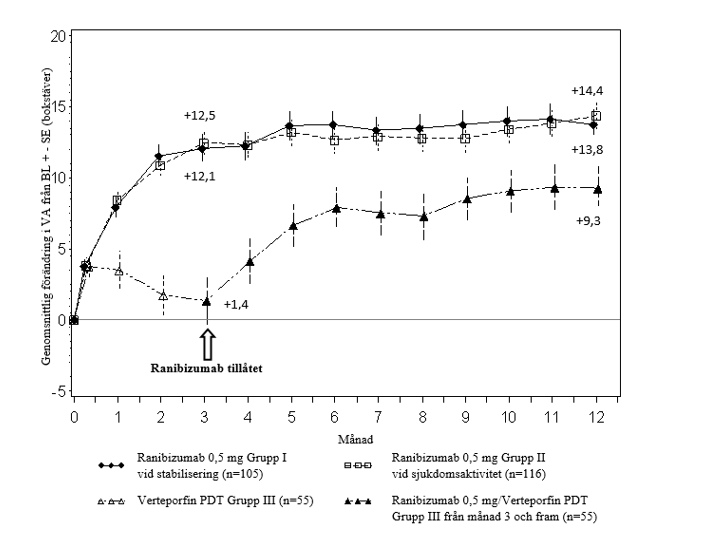 Det genomsnittliga antalet injektioner som gavs under 12 månader var 5,8 i gruppen med ranibizumab mot 5,4 i patientgruppen som fick sham som var berättigade att få ranibizumab from månad 2 och framåt. I sham-gruppen fick 7 av 59 patienter inte någon behandling med ranibizumab i studieögat under 12-månadersperioden.
