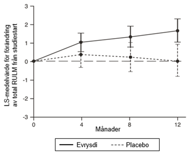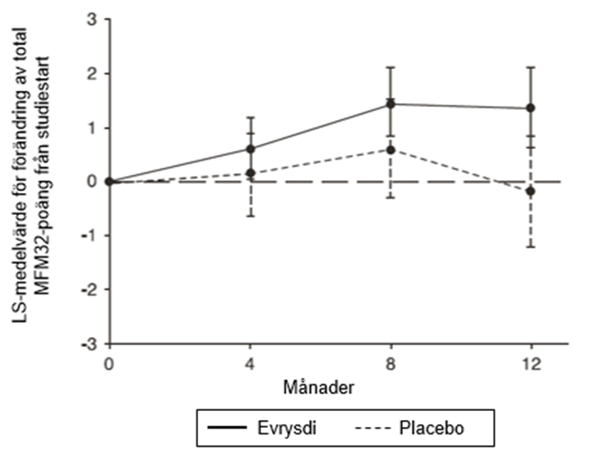 De viktigaste effektmåtten för patienter behandlade med Evrysdi visas i tabell 4 och 5 samt i figur 5.