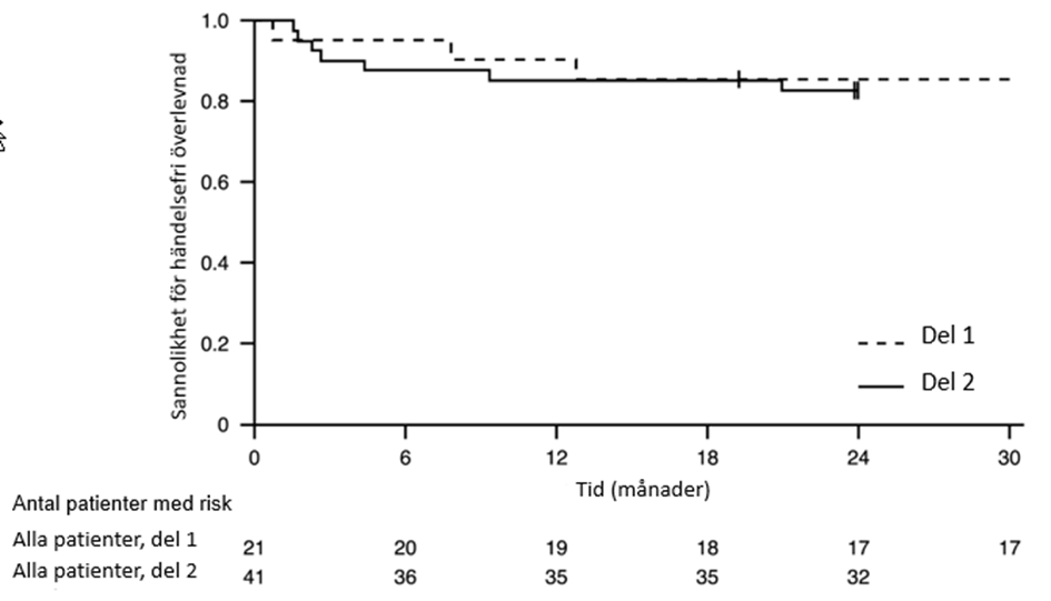Dessutom uppnådde 80 % (4/5) av populationen där primär effekt utvärderades, 87,5 % (7/8) av patienterna med 2 SMN2-kopior och 80,8 % (21/26) av patienterna i ITT-populationen sittande utan stöd i 30 sekunder (BSID-III, Item 26).