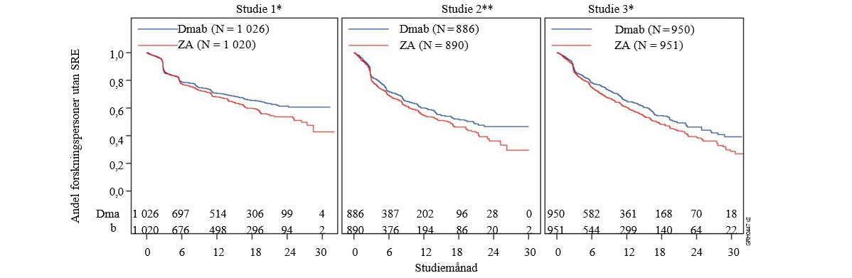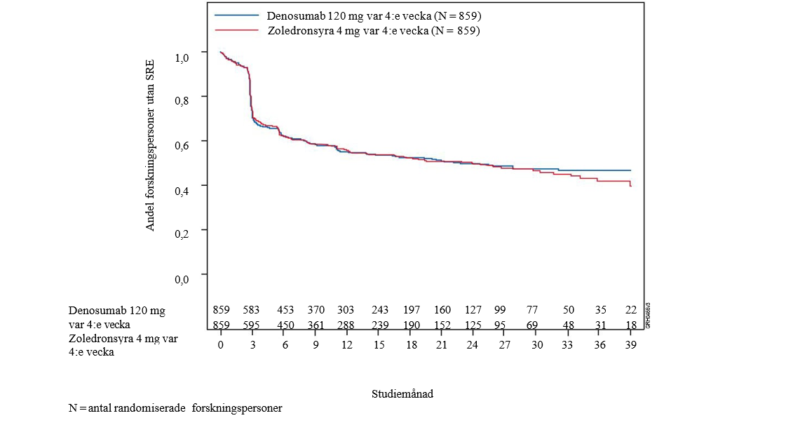 Effekt och säkerhet av 120 mg denosumab subkutant var 4:e vecka eller 4 mg zoledronsyra (dosjusterad vid nedsatt njurfunktion) intravenöst var 4:e vecka jämfördes i tre randomiserade, dubbelblindade, aktivt kontrollerade studier hos patienter med avancerad cancer med skelettmetastaser och som var behandlingsnaiva för intravenösa bisfosfonater: vuxna med bröstcancer (studie 1), andra solida tumörer eller multipelt myelom (studie 2) och kastratresistent prostatacancer (studie 3). I dessa kliniska prövningar med aktiv kontroll utvärderades säkerheten hos 5 931 patienter. Patienter med en anamnes av ONJ eller osteomyelit i käken, pågående tand- eller käkbesvär som krävde käkkirurgi, oläkta sår efter tand- eller käkkirurgi eller med ett inplanerat invasivt tandingrepp fick inte delta i dessa studier. De primära och sekundära effektmåtten utvärderade förekomst av en eller flera skelettrelaterade händelser (SRE). I studier där denosumab visade sig vara mer effektivt än zoledronsyra erbjöds patienterna deltagande i en på förhand specificerad fas med utökad denosumab-behandling på 2 år. En SRE definierades som något av följande: patologisk fraktur (kot- eller icke-kotfraktur), strålbehandling av skelettet (inklusive användning av radioisotoper), skelettkirurgi eller ryggmärgskompression.
