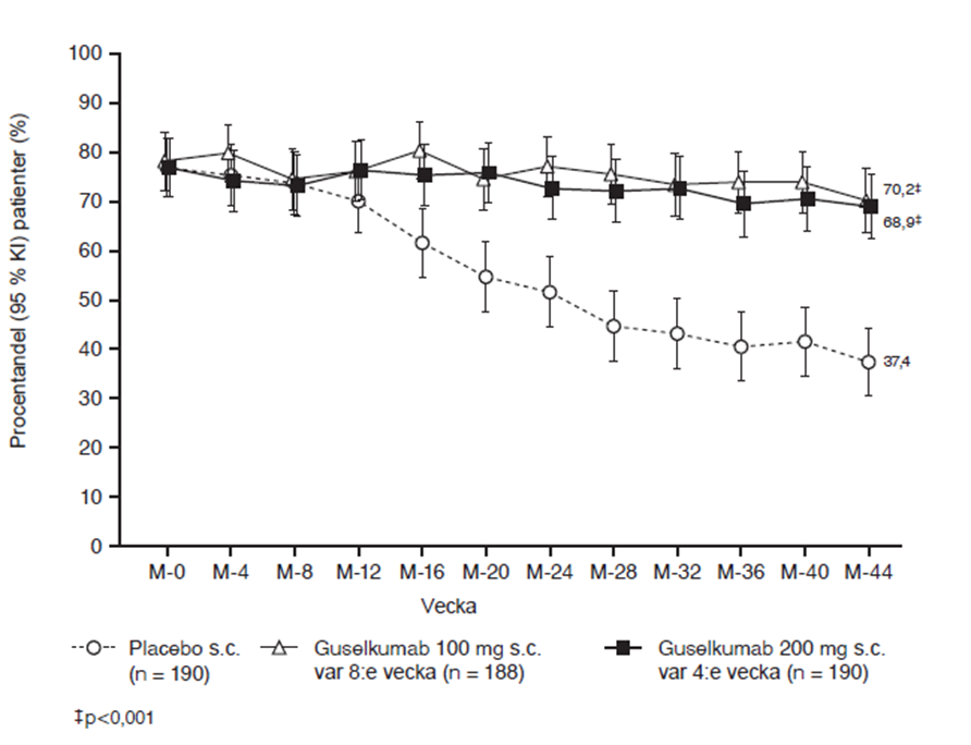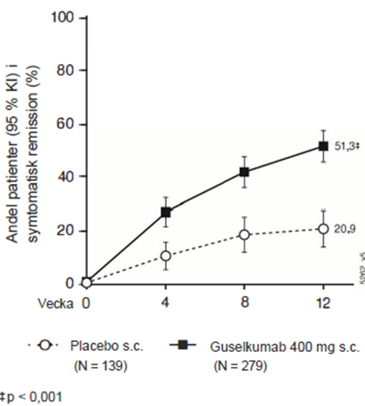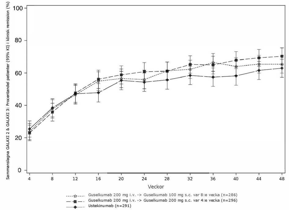 Klinisk remission vid vecka 24 uppnåddes av en signifikant större andel patienter som behandlades med guselkumab 400 mg subkutan induktion följt av guselkumab 100 mg subkutant var 8:e vecka eller 200 mg subkutant var 4:e vecka jämfört med placebo (60,9 % respektive 58,3 % mot 21,4 %, båda p‑värdena < 0,001). Klinisk remission vid vecka 48 uppnåddes av 60 % respektive 66,1 % av patienterna som behandlades med guselkumab 400 mg subkutan induktion följt av guselkumab 100 mg subkutant var 8:e vecka eller 200 mg subkutant var 4:e vecka (båda p-värdena < 0,001 jämfört med placebo).