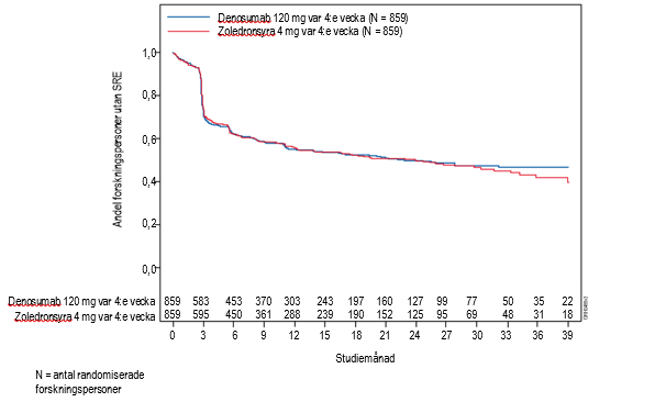 Effekt och säkerhet av 120 mg denosumab subkutant var 4:e vecka eller 4 mg zoledronsyra (dosjusterad vid nedsatt njurfunktion) intravenöst var 4:e vecka jämfördes i tre randomiserade, dubbelblindade, aktivt kontrollerade studier hos patienter med avancerad cancer med skelettmetastaser och som var behandlingsnaiva för intravenösa bisfosfonater: vuxna med bröstcancer (studie 1), andra solida tumörer eller multipelt myelom (studie 2) och kastratresistent prostatacancer (studie 3). I dessa kliniska prövningar med aktiv kontroll utvärderades säkerheten hos 5 931 patienter. Patienter med en anamnes av ONJ eller osteomyelit i käken, pågående tand- eller käkbesvär som krävde käkkirurgi, oläkta sår efter tand- eller käkkirurgi eller med ett inplanerat invasivt tandingrepp fick inte delta i dessa studier. De primära och sekundära effektmåtten utvärderade förekomst av en eller flera skelettrelaterade händelser (SRE). I studier där denosumab visade sig vara mer effektivt än zoledronsyra erbjöds patienterna deltagande i en på förhand specificerad fas med utökad denosumab ‑behandling på 2 år. En SRE definierades som något av följande: patologisk fraktur (kot- eller icke‑kotfraktur), strålbehandling av skelettet (inklusive användning av radioisotoper), skelettkirurgi eller ryggmärgskompression.