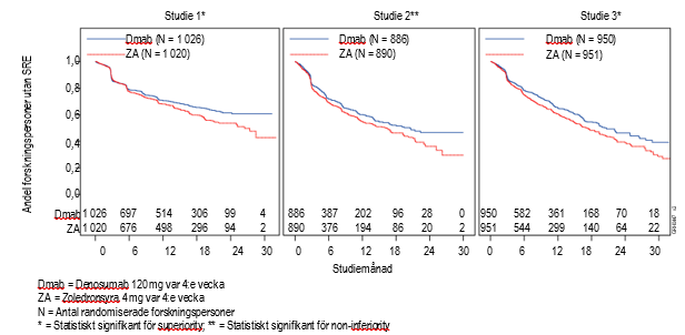 I samtliga tre studier var sjukdomsprogressionen densamma för denosumab och zoledronsyra. Så var också fallet för den i förväg specificerade analysen av de tre studierna tillsammans.