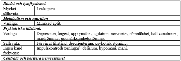 Biverkningar som rapporterats under kliniska prövningar, användning efter godkännande för försäljning och i litteraturen listas enligt MedDRA:s klassificering av organsystem. Inom varje klass av organsystem anges biverkningar efter frekvens, den vanligaste först, med följande fördelning: mycket vanliga (≥ 1/10), vanliga (≥ 1/100, < 1/10), mindre vanliga (≥ 1/1 000, < 1/100), sällsynta (≥ 1/10 000, < 1/1 000), mycket sällsynta (< 1/10 000), ingen känd frekvens (kan inte beräknas från tillgängliga data). Inom varje frekvensgruppering redovisas biverkningar i fallande svårighetsgrad.