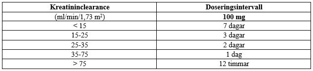Tabell 1. 100 mg doseringsintervall baserat på kreatinclearance