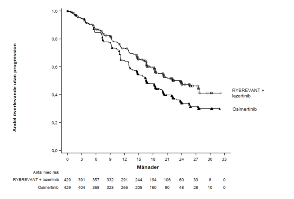 Rybrevant intravenös formulering i kombination med lazertinib uppvisade en statistiskt signifikant förbättring av progressionsfri överlevnad (PFS) enligt BICR-bedömning.