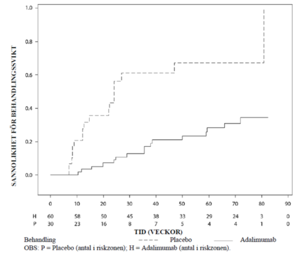 Adalimumab fördröjde signifikant tiden till behandlingssvikt i jämförelse med placebo (se figur 2, p<0,0001 från log rank test). Mediantiden till behandlingssvikt var 24,1 veckor för patienter som behandlades med placebo, medan mediantiden till behandlingssvikt för patienter som behandlades med adalimumab inte gick att fastställa eftersom mindre än hälften av dessa patienter upplevde behandlingssvikt. Adalimumab minskade signifikant risken för behandlingssvikt med 75 % jämfört med placebo, vilket framgår av hazardkvoten (HR = 0,25 [95 % CI: 0,12; 0,49]).