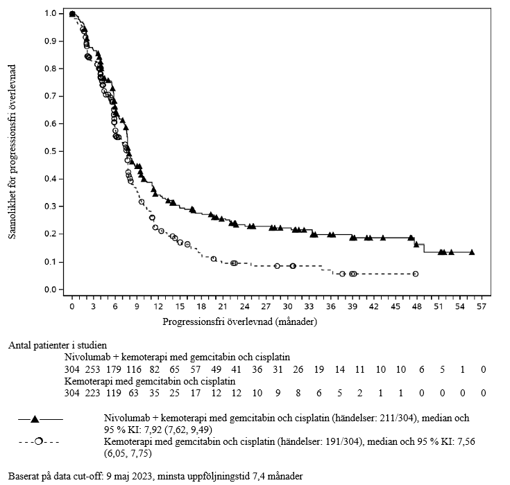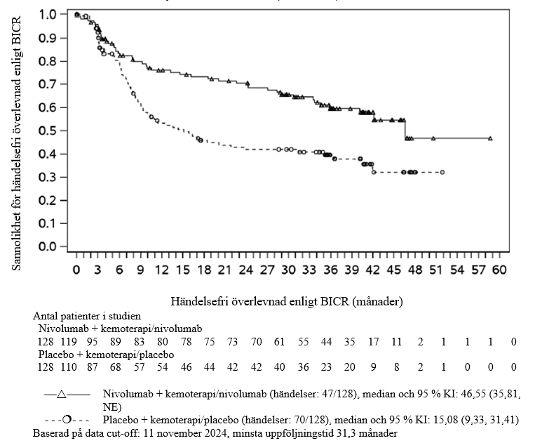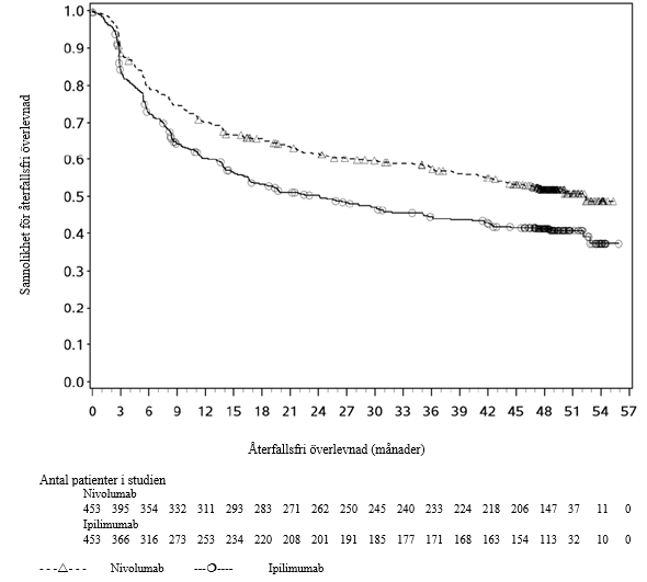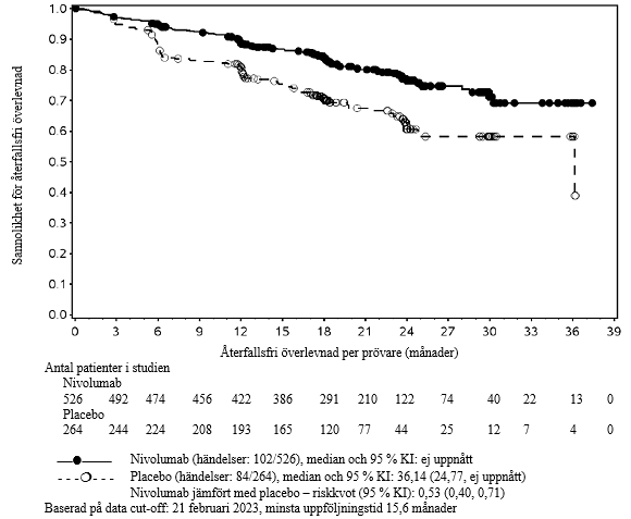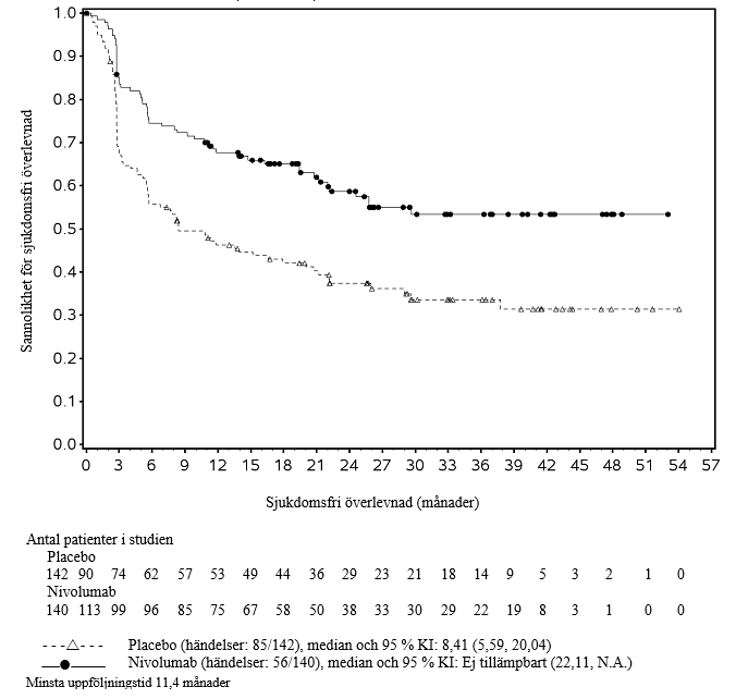 En primär förhandsspecificerad interimsanalys (minsta uppföljningstid 6,2 månader, median uppföljningstid 24,4 månader), visade på en statistiskt signifikant förbättring i sjukdomsfri överlevnad för patienter som randomiserats till nivolumab jämfört med placebo. Median sjukdomsfri överlevnad, bestämd av prövaren, var 22,41 månader (95 % KI: 16,62, 34,00) för nivolumab jämfört med 11,04 månader (95 % KI: 8,34, 14,32) för placebo, riskkvot 0,69 (96,4 % KI: 0,56, 0,86), p‑värde < 0,0003. Primär analys av sjukdomsfri överlevnad inkluderade censurering för ny cancerbehandling. Resultaten för sjukdomsfri överlevnad med eller utan censurering för ny cancerbehandling var konsekventa. I en uppdaterad deskriptiv analys av sjukdomsfri överlevnad med minsta uppföljningstid på 14 månader och en median uppföljningstid på 32,2 månader, bekräftades förbättringen av sjukdomsfri överlevnad. Effektresultat för denna deskriptiva sekundära analysen visas i tabell 39 och figur 27.