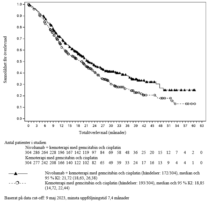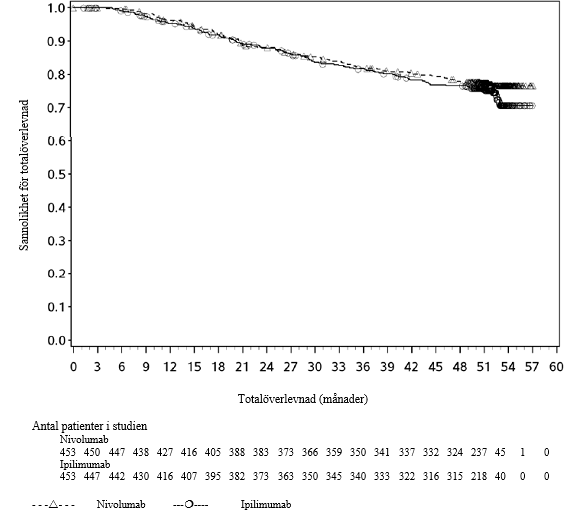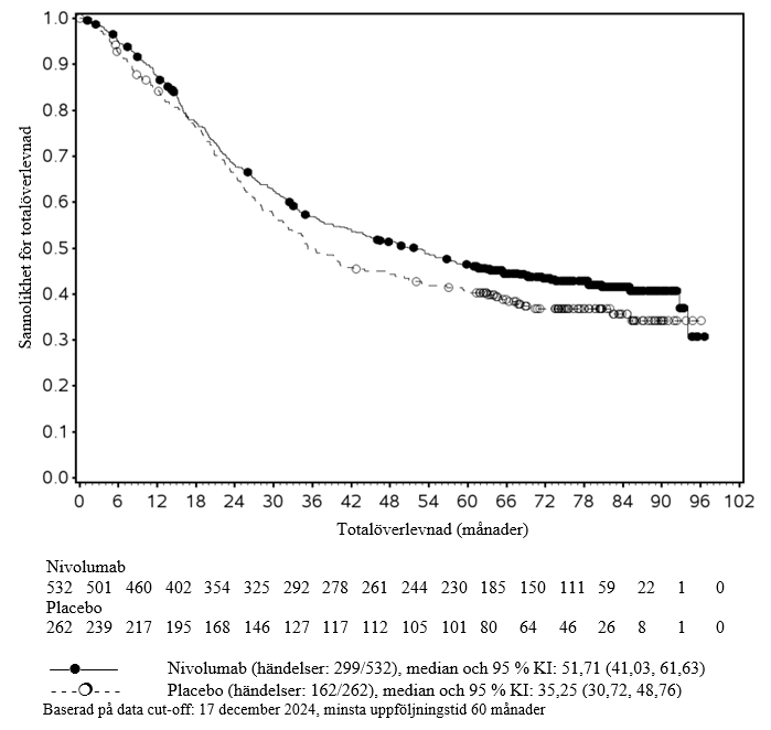 Vid den slutliga OS-analysen med en minsta uppföljningstid på 60 månader var HR för OS 0,85 (95,87 % KI: 0,70, 1,04), p‑värde = 0,1064. Median-OS var 51,71 (95 % KI: 41,03, 61,63) månader i nivolumab-armen jämfört med 35,25 (95 % KI: 30,72, 48,76) månader i placeboarmen. Kaplan‑Meier‑kurvorna för totalöverlevnad med en minsta uppföljningstid på 60 månader visas i figur 28.