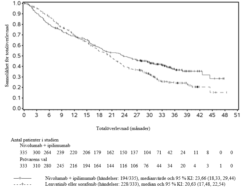 Totalt randomiserades 668 patienter till nivolumab i kombination med ipilimumab (n = 335) eller prövarens val (n = 333) av lenvatinib eller sorafenib. I armen med prövarens val fick 85 % av de behandlade patienterna lenvatinib och 15 % sorafenib. Patienterna i armen med nivolumab plus ipilimumab fick 1 mg/kg nivolumab var tredje vecka i kombination med 3 mg/kg ipilimumab var tredje vecka i högst 4 doser, följt av 480 mg nivolumab som monoterapi var fjärde vecka. Patienterna i armen med prövarens val fick 8 mg lenvatinib peroralt dagligen (om kroppsvikten var < 60 kg), 12 mg lenvatinib peroralt dagligen (om kroppsvikten var ≥ 60 kg) eller 400 mg sorafenib peroralt två gånger dagligen. Behandlingen fortsatte till sjukdomsprogression, oacceptabel toxicitet eller upp till 24 månader. Patienter som avbröt kombinationsbehandlingen på grund av en biverkning som tillskrevs ipilimumab hade möjlighet att fortsätta med nivolumab som enda läkemedel. Tumörbedömningar utfördes vid studiestart, efter randomisering vid vecka 9 och vecka 16, därefter var 8:e vecka fram till 48 veckor och därefter var 12:e vecka till sjukdomsprogress, utsättning av behandlingen eller påbörjan av efterföljande behandling.