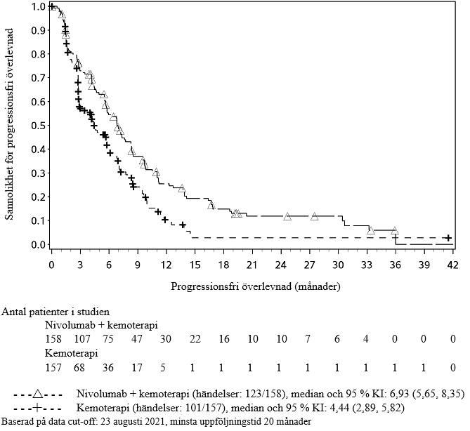 Vid en uppdaterad deskriptiv analys med en minsta uppföljningstid på 20 månader var förbättring i totalöverlevnad överensstämmande med den primära analysen. Medianvärdet för totalöverlevnad var 15,05 månader (95 % KI: 11,93, 18,63) för nivolumab plus kemoterapi jämfört med 9,07 månader (95 % KI: 7,69, 10,02) för kemoterapi (HR = 0,59; 95 % KI: 0,46, 0,76). Medianvärdet för progressionsfri överlevnad var 6,93 månader (95 % KI: 5,68, 8,35) för nivolumab plus kemoterapi jämfört med 4,44 månader (95 % KI: 2,89, 5,82) för kemoterapi (HR = 0,66; 95 % KI: 0,50, 0,87). Den objektiva responsfrekvensen var 53,2 % (95 % KI: 45,1, 61,1) för nivolumab plus kemoterapi jämfört med 19,7 % (95 % KI: 13,8, 26,8) för kemoterapi.