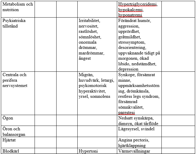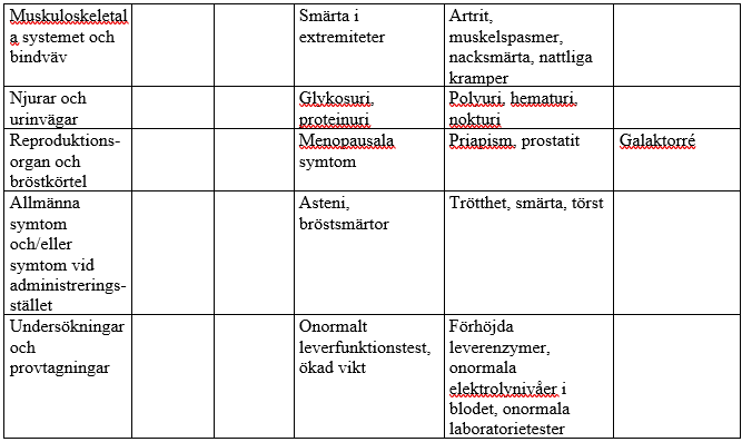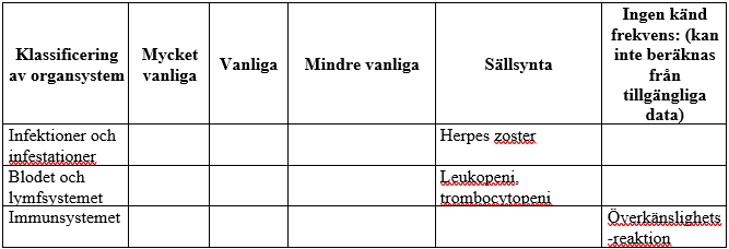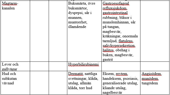 Mycket vanliga (≥1/10); Vanliga (≥1/100 till <1/10); Mindre vanliga (≥1/1 000 till <1/100); Sällsynta (≥1/10 000 till <1/1 000); Mycket sällsynta (<1/10 000); Ingen känd frekvens (kan inte beräknas från tillgängliga data).