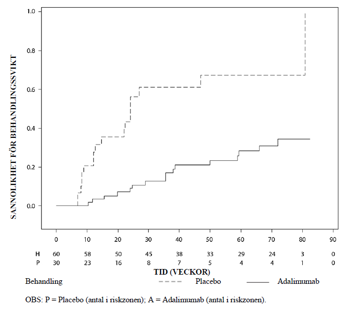 Adalimumab fördröjde signifikant tiden till behandlingssvikt i jämförelse med placebo (se figur 2, p < 0,0001 från log rank test). Mediantiden till behandlingssvikt var 24,1 veckor för patienter som behandlades med placebo, medan mediantiden till behandlingssvikt för patienter som behandlades med adalimumab inte gick att fastställa eftersom mindre än hälften av dessa patienter upplevde behandlingssvikt. Adalimumab minskade signifikant risken för behandlingssvikt med 75 % jämfört med placebo, vilket framgår av hazard-kvoten (HR = 0,25 [95 % CI: 0,12; 0,49]).