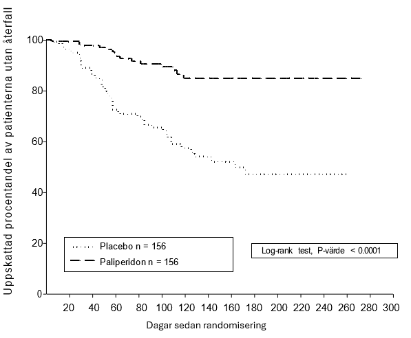 Paliperidons effektivitet att upprätthålla symtomkontroll och fördröja återfall av schizofreni fastställdes i en lång, dubbelblind, placebokontrollerad studie med flexibla doser omfattande 849 vuxna patienter (ej äldre) som uppfyllde DSM-IV-kriterierna för schizofreni. I studien ingick en 33 veckor lång, öppen fas av akut behandling och stabilisering, en randomiserad, dubbelblind, placebokontrollerad fas för observation av återfall samt en 52 veckor lång öppen förlängningsperiod. I denna studie gavs paliperidondoser på 25, 50, 75 och 100 mg månatligen; 75 mg-dosen tilläts endast i den 52 veckor långa öppna förlängningsdelen av studien. Patienterna fick initialt flexibla doser (25‑100 mg) av paliperidon under en 9 veckor lång övergångsperiod, vilken följdes av en 24 veckor lång underhållsperiod där patienternas PANSS-poäng skulle vara ≤ 75. Dosjusteringar tilläts endast i de första 12 veckorna av underhållsperioden. Totalt 410 stabiliserade patienter randomiserades till att antingen få paliperidon (genomsnittlig behandlingslängd 171 dagar [intervall 1 dag till 407 dagar]) eller placebo (genomsnittlig behandlingslängd 105 dagar [intervall 8 dagar till 441 dagar]) fram tills de fick ett återfall av schizofrenisymtomen i den dubbelblinda fasen med varierande längd. Prövningen avbröts i förtid på grund av effektskäl eftersom man observerade en signifikant längre tid fram till återfall (p < 0,0001, figur 1) hos patienterna som behandlades med paliperidon jämfört med dem som fick placebo (riskkvot [hazard ratio] = 4,32; 95 % KI: 2,4‑7,7).