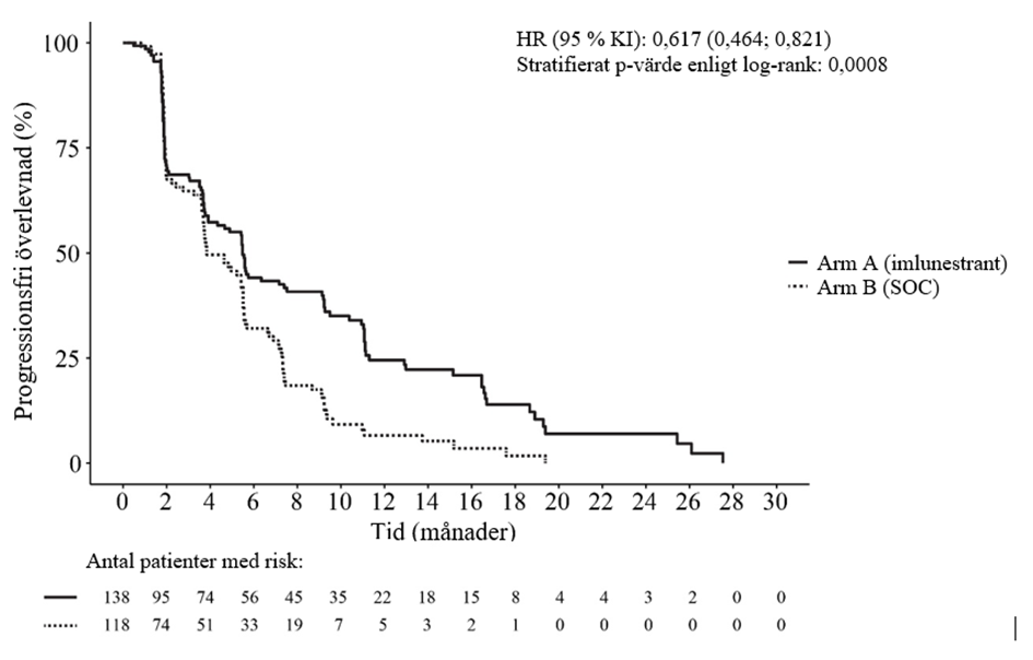 Vid den tredje interimsanalysen av OS (brytdatum 18 augusti 2025) observerades 128 händelser i de två armarna. HR var 0,60 (95 % KI: 0,43; 0,86).