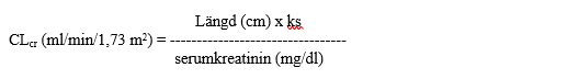 CLcr ml/min/1,73 m2 kan värderas genom bestämning av serumkreatinin (mg/dl), för yngre ungdomar och barn, genom att använda följande formel (Schwartz formel):