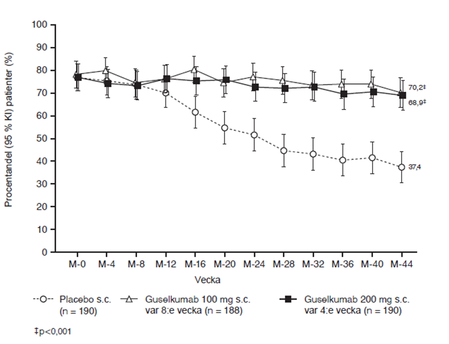 Signifikant större andelar av patienterna var i klinisk remission vid vecka 44 i båda grupperna som behandlades med guselkumab jämfört med placebo.