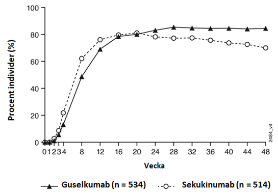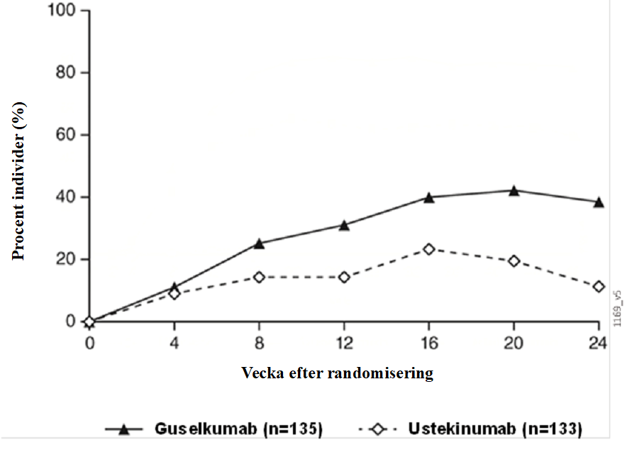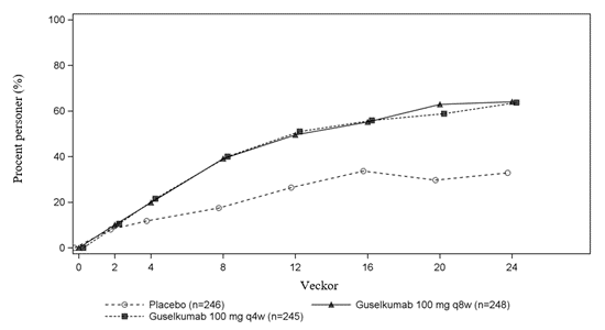 Behandling med guselkumab resulterade i signifikanta förbättringar av utfallsmåtten på sjukdomsaktivitet jämfört med placebo vecka 16. De viktigaste effektresultaten för studiens effektmått visas i tabell 22 nedan.