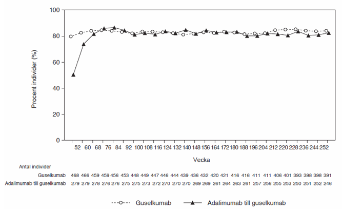 Bland de patienter som hade randomiserats till placebo vid vecka 0 och inte uppnått PASI 90-respons vid vecka 16, uppnådde 95,0 % en PASI 75-respons och 65,0 % PASI 90-respons vid vecka 52 efter övergång till behandling med guselkumab.