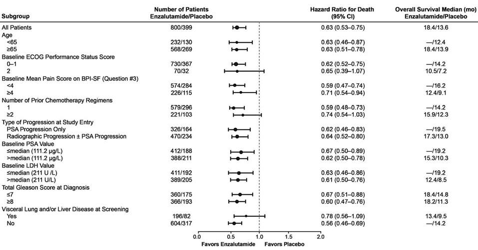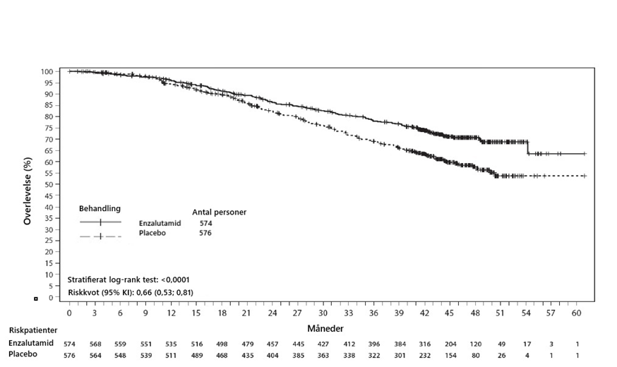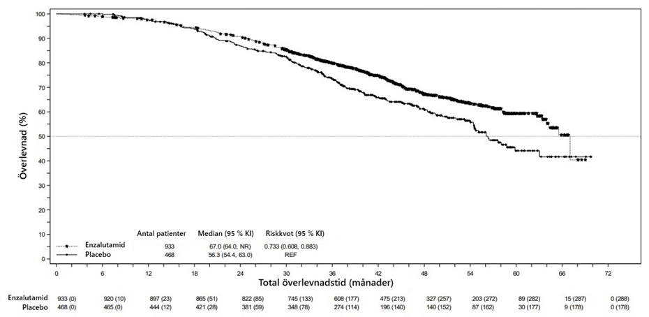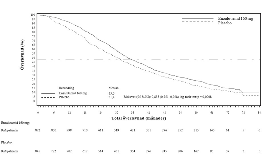 Den i protokollet förspecifierade interimanalysen efter 520 dödsfall visade en statistiskt signifikant överlägsenhet i total överlevnad för patienter behandlade med enzalutamid jämfört med placebo (Tabell 6 och Figur 12 och 13).