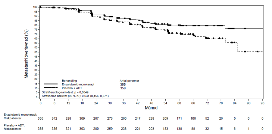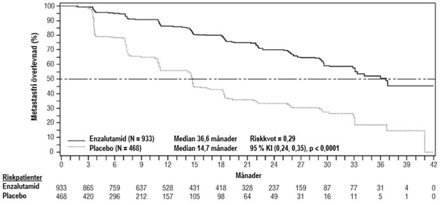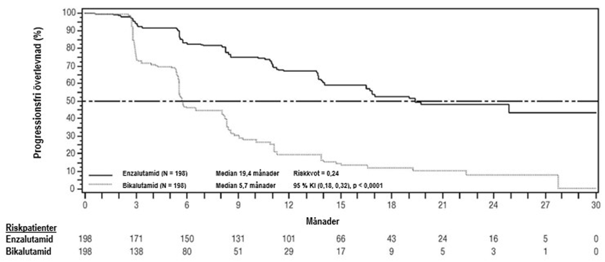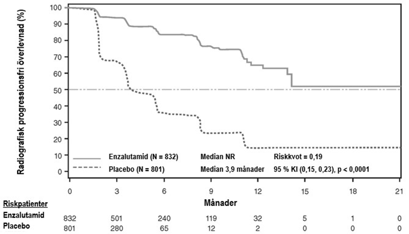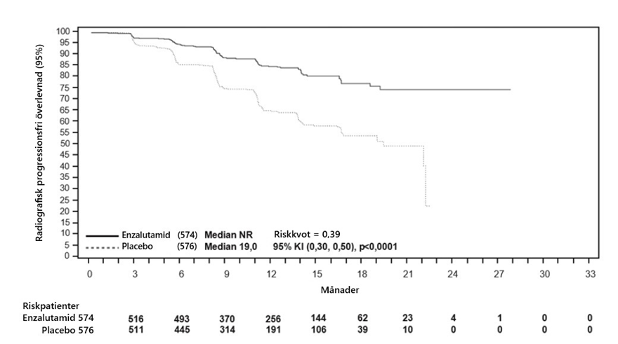 Radiografisk progressionsfri överlevnad bedömdes av prövaren genom användandet av RECIST v1.1. för mjukdelsvävnad och uppkomst av två eller flera sjukliga förändringar i ben bedömdes med benscanning. Resultatet visade på 8,3 månader för patienter behandlade med enzalutamid och 2,9 månaders för patienter som fick placebo [HR = 0,40 (95 % KI: 0,35, 0,47), p < 0,0001]. Analysen innefattade 216 dödsfall utan dokumenterad progression och 645 dokumenterade progressionshändelser, av vilka 303 (47 %) berodde på mjukdelsprogression, 268 (42 %) berodde på sjukliga förändringar i ben och 74 (11 %) berodde både på försämringar i mjukdelsvävnad och sjukliga förändringar i ben.