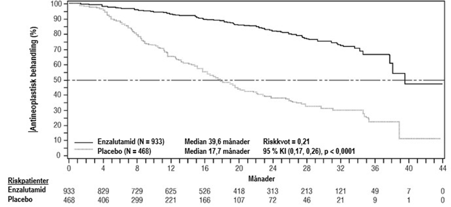 Mediantiden till insättning av cytotoxisk kemoterapi var 28,0 månader för patienter som fick enzalutamid och 10,8 månader för patienter som fick placebo [HR = 0,35 (95 % KI: 0,30, 0,40), p < 0,0001].