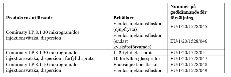 Endosinjektionsflaskor med Comirnaty LP.8.1 innehåller 1 dos 0,3 ml vaccin.